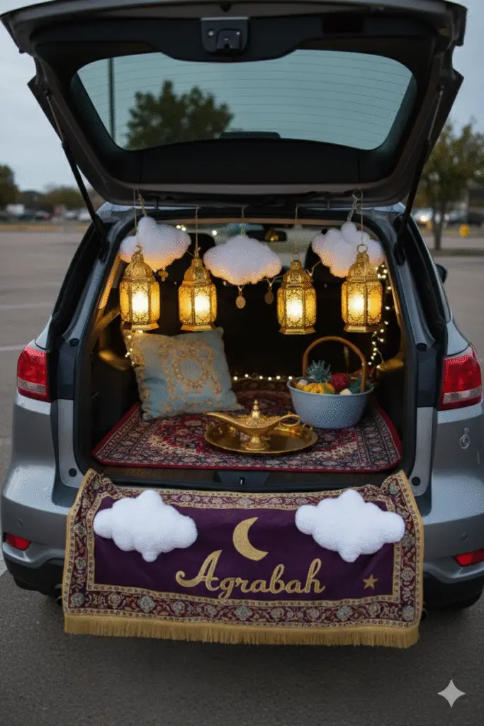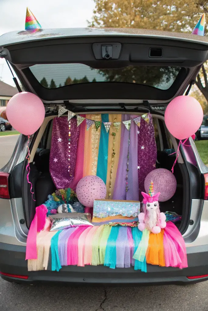 Drape your trunk with rainbow fabric, pom-poms, and shimmering garlands to create a unicorn wonderland. The vibrant colors make your car sparkle, and kids love the enchanted vibe.