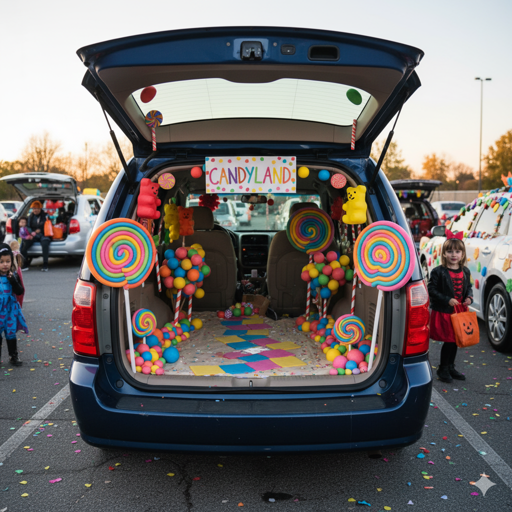 Transform your trunk into a sugar wonderland with oversized lollipops, colorful lights, and candy props. This theme always brings smiles—kids feel like they’re stepping into a real-life Candy Land game.