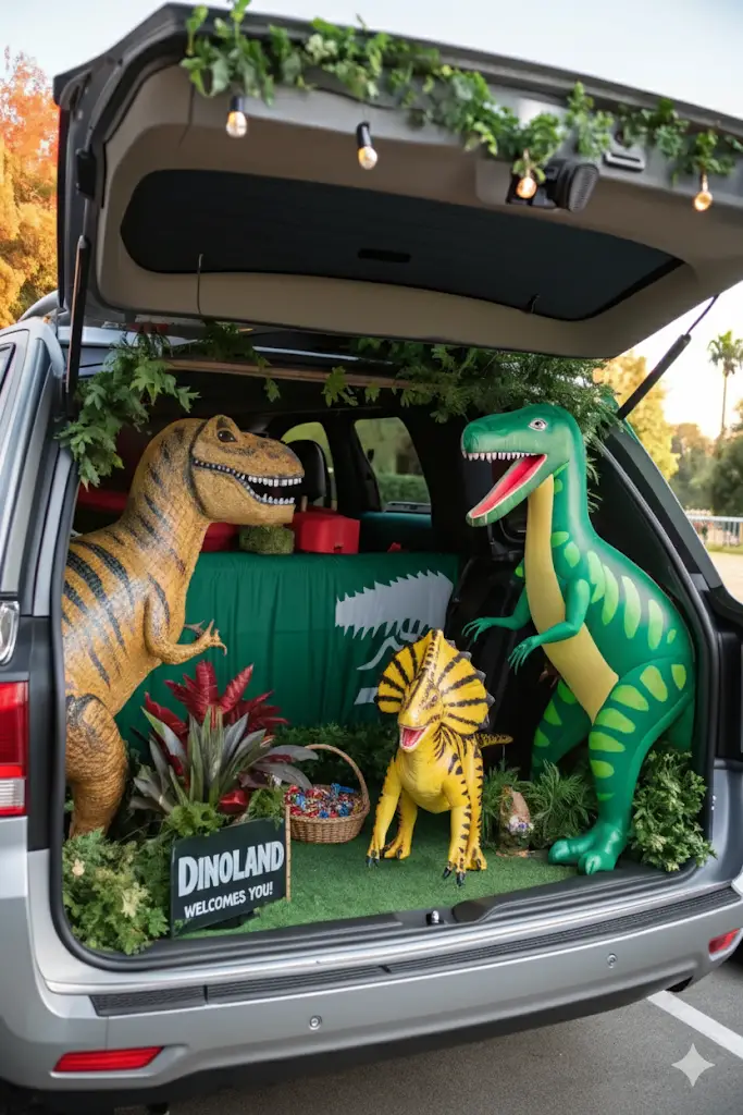 Bring Jurassic Park to life with inflatable dinosaurs, fake plants, and dino tracks. Kids love spotting the “roaring” dinos at your trunk.