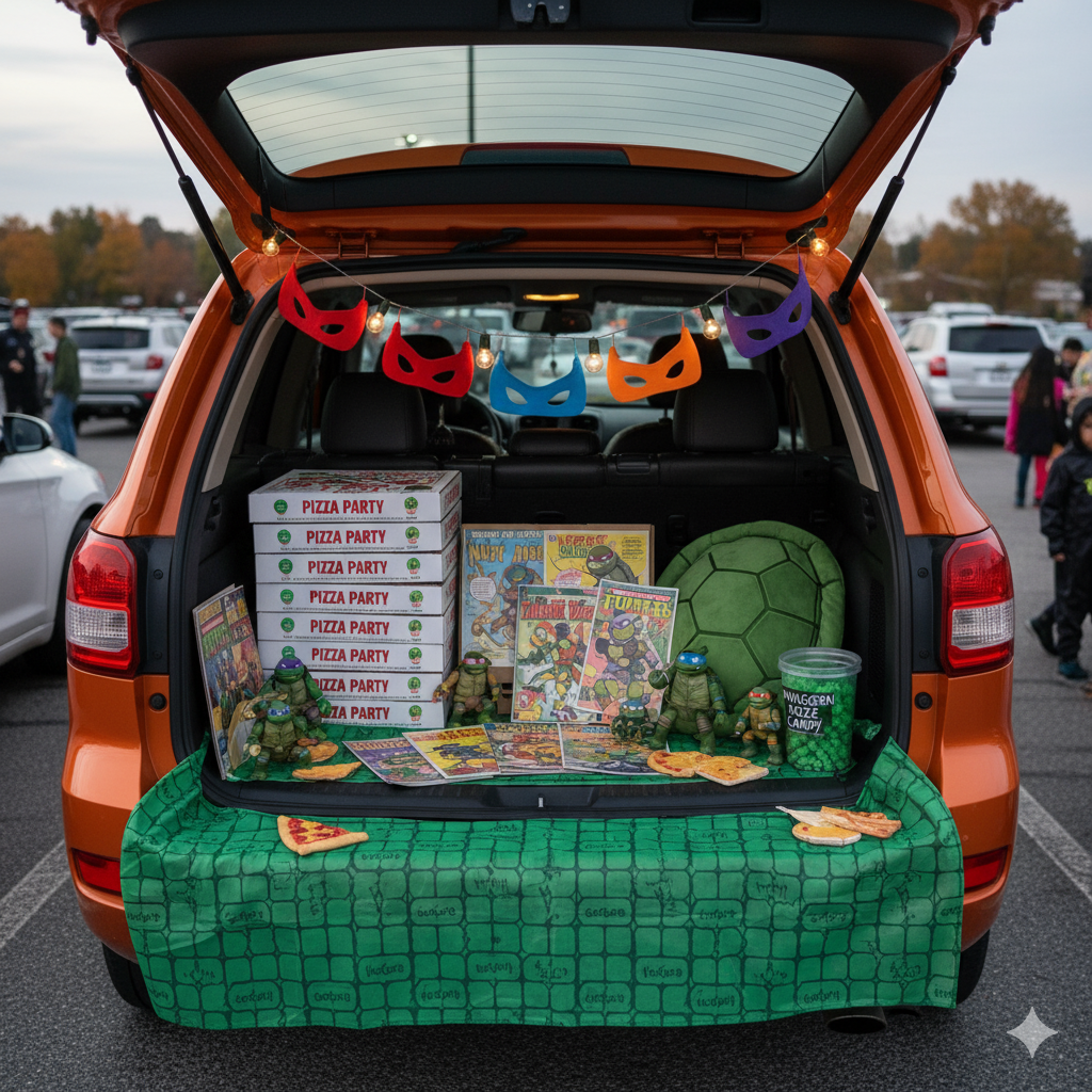 Celebrate the Teenage Mutant Ninja Turtles with green fabric, orange accents, and pizza slice props. Perfect for families who want to dress up as their favorite turtles.