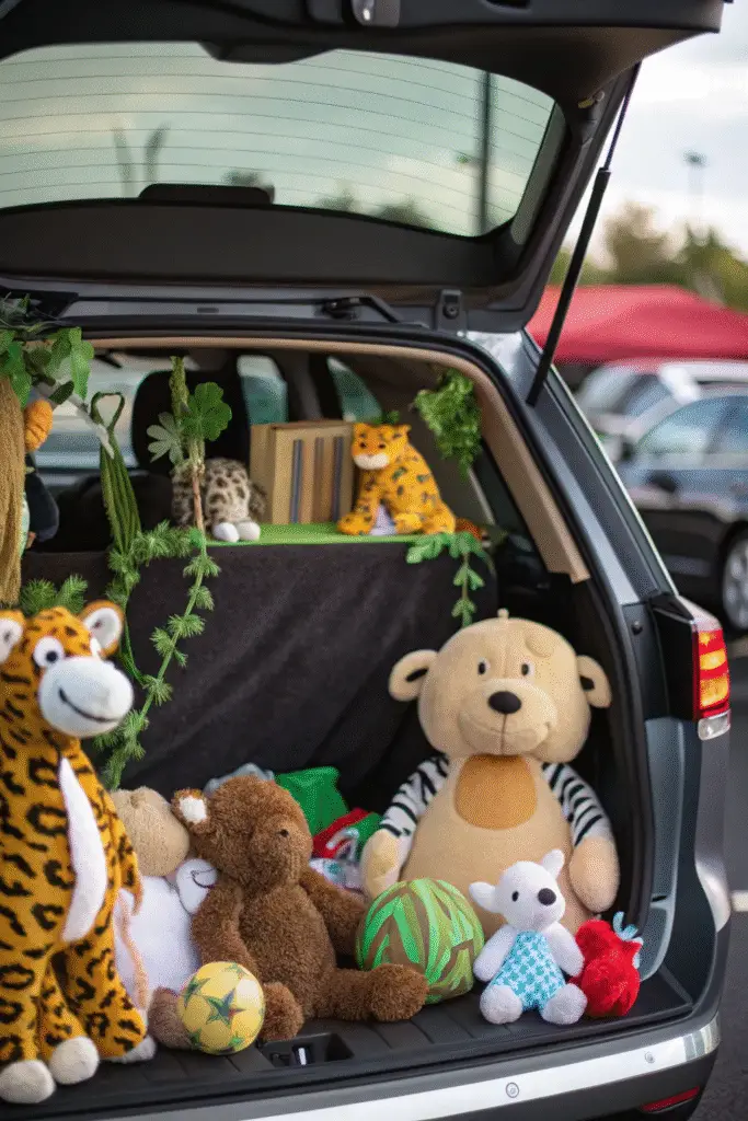 Have a stash of stuffed animals at home? Turn them into a “zoo trunk”! Add a faux gate, vines, and greenery for that wild adventure feel. This budget-friendly theme is always a hit with younger kids.