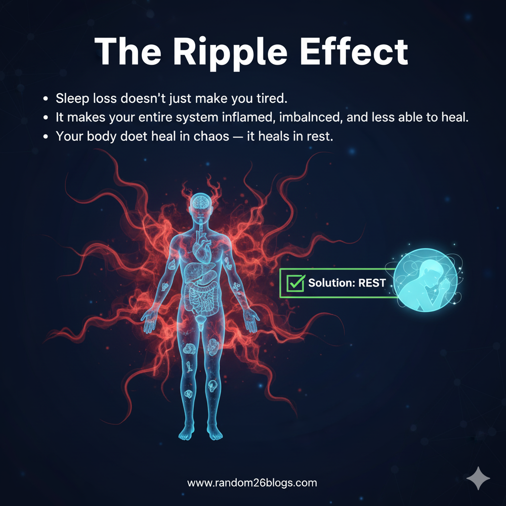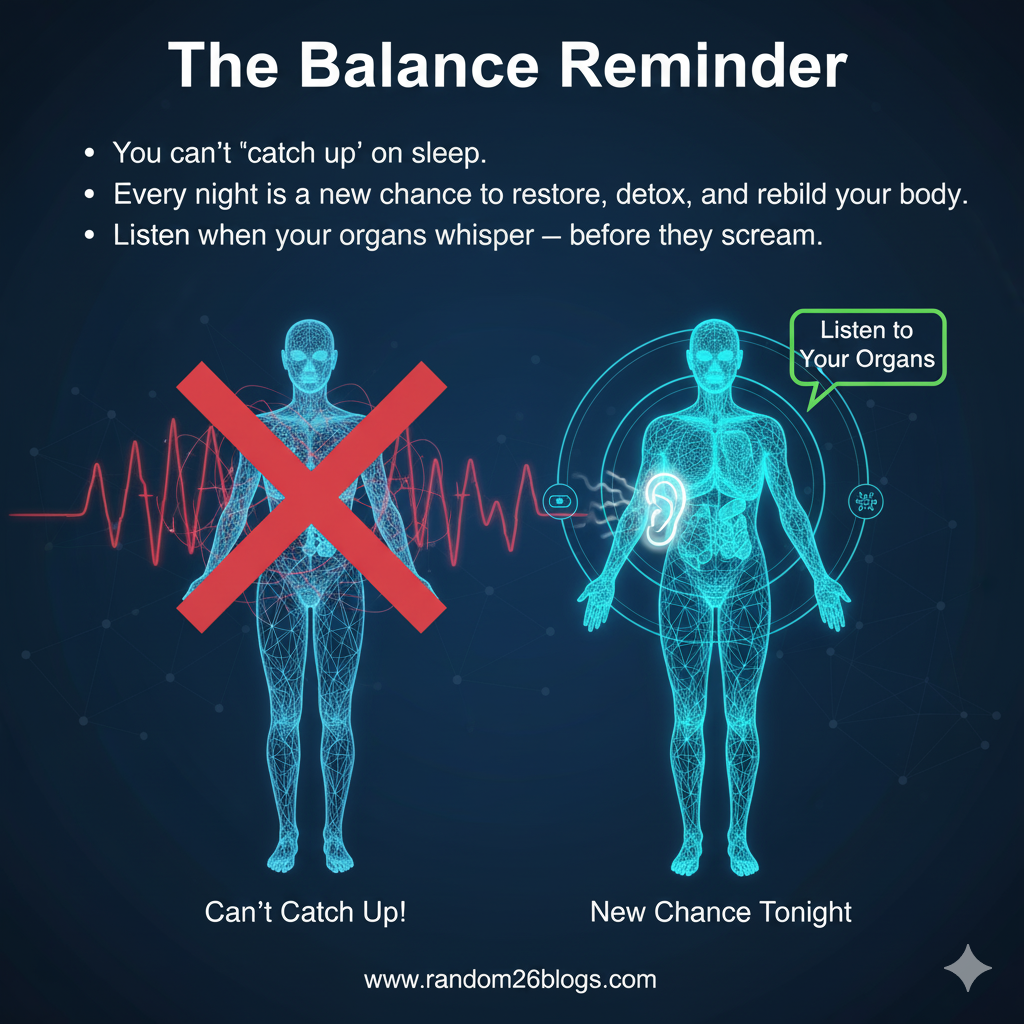 Missing sleep doesn’t just make you tired — it throws your entire body off balance. Inflammation rises, detox slows, and your organs lose their chance to reset. You can’t “catch up” on missed rest; every night is an opportunity for renewal.