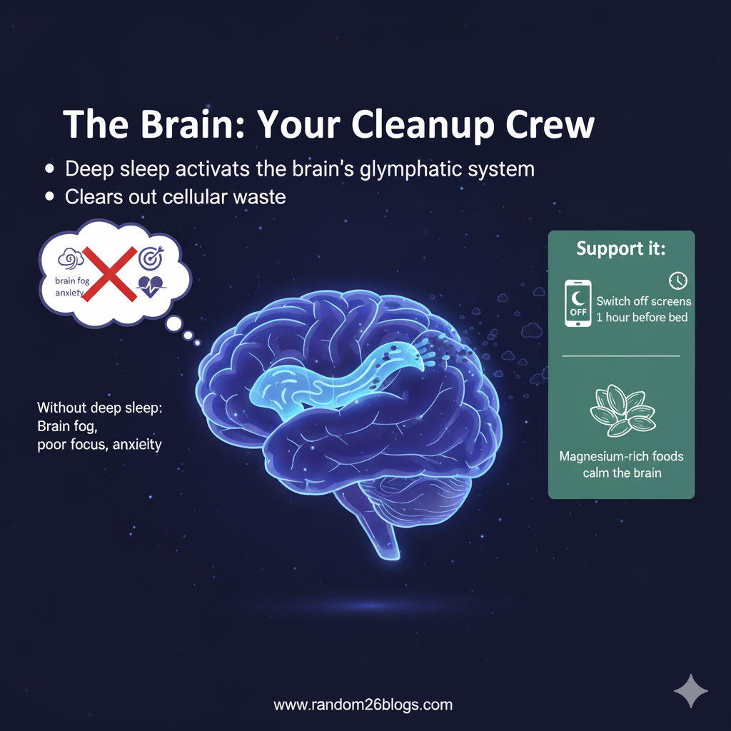 Tip: Support your glymphatic system by turning off screens an hour before bed to promote melatonin production, which triggers deep sleep. Include magnesium-rich foods like pumpkin seeds and almonds in your evening meal to relax the nervous system naturally.