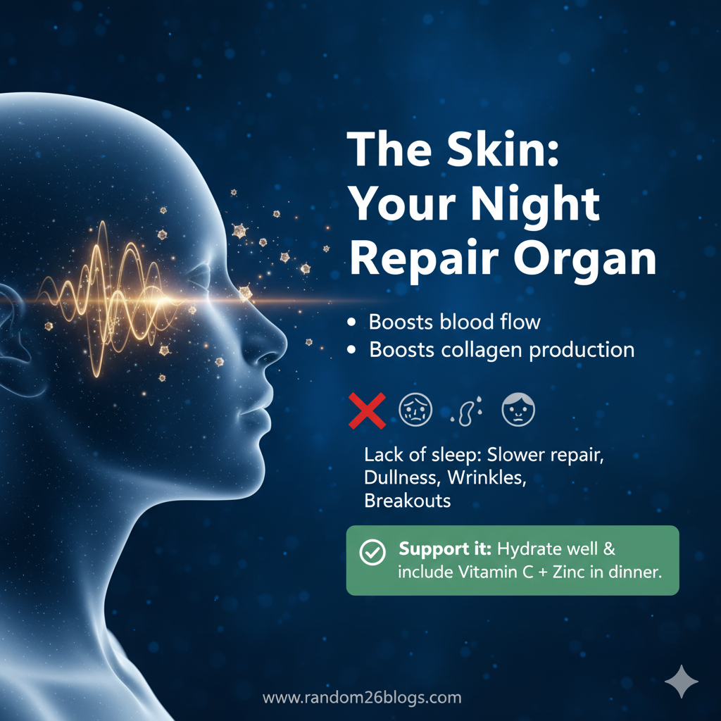 Your skin doesn’t just glow from good skincare — it depends on deep sleep for its natural repair cycle. During the night, your body releases Human Growth Hormone (HGH), which drives collagen synthesis and cell turnover. Blood flow to the skin also increases, delivering oxygen and nutrients needed for repair.